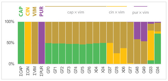 Frequency of species-specific SSM in hybrids (Salix subgen. Vetrix) compared with S. purpurea. Thirteen hybrids from the CCV dataset of uncertain origin were additionally tested for the presence of species-specific markers from seven other Vetrix species (has-myr dataset). Two samples were identified as S. purpurea × S. viminalis hybrids, 3 hybrid samples (from the has-myr dataset) collected in the wild (2 samples of S. caprea × S. viminalis, 1 sample of S. cinerea × S. viminalis) have the same profiles as hybrids from the experimental garden (CCV dataset). A further 11 hybrids of uncertain origin were not positive for the presence of markers of S. aurita, S. hastata, S. myrtilloides, S. rosmarinifolia, and S. eleagnos; presented are samples G33 and G34 showing uncertain pattern. The graph shows proportion of SSM presented in >50% of samples with values recalculated to average number of SSM per sample—compare with Figure 1c. CAP = S. caprea; CIN = S. cinerea; VIM = S. viminalis; PUR = S. purpurea.
