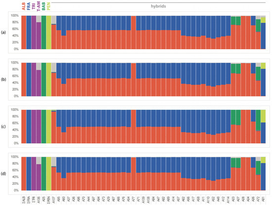 Frequency of species-specific markers in Salix hybrids (AF dataset, Salix subgen. Salix). (a) All SSM: proportion of all detected species-specific markers present at least in 1 sample of the species; (b) SSM > 50%: proportion of SSM present in >50% of samples of the species; (c) proportion of SSM present in >50% of samples of the species proportioned to average number of SSM per sample of the species; (d) proportion of SSM present in >50% of samples of the species proportioned to total number of SSM of the species. ALB = S. alba; FRA = S. fragilis; TRI = S. triandra; PEN = S. pentandra; BAB = S. babylonica ‘Babylon’; none = markers present in hybrids only not belonging to any species of the CCV or AF dataset; T-AM = S. triandra from Transcaucasia (Armenia).