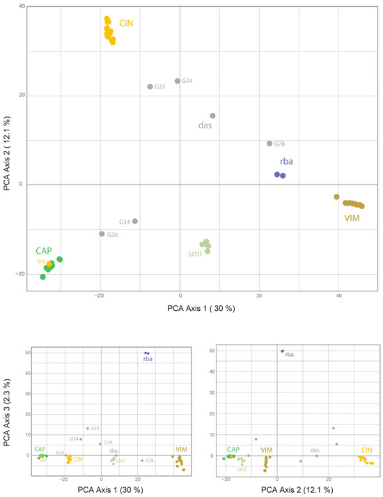 Principal coordinate analysis of Salix hybrids (CCV dataset, Salix subgen. Vetrix) based on 85,915 binary SNPs of 77 samples, showing 3 major axes of variability. CAP = S. caprea; CIN = S. cinerea; VIM = S. viminalis; smi = S. caprea × S. viminalis; das = S. cinerea × S. viminalis; rba = S. purpurea × S. viminalis.