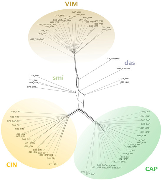 Neighbour-joining unrooted dendrogram for Salix subgen. Vetrix based on 85,915 binary SNPs generated in SplitsTree (Fit: 99.94). CAP = S. caprea; CIN = S. cinerea; VIM = S. viminalis; smi = S. caprea × S. viminalis (S. ×smithiana); das = S. cinerea × S. viminalis. Parental taxa (S. caprea, S. cinerea, S. viminalis) are well separated, hybrids S. caprea × S. viminalis and S. cinerea × S. viminalis have intermediate position, however, hybrids of different origin share the false intermediate position.
