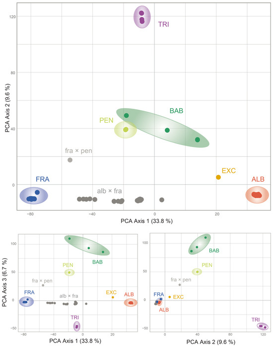 Principal coordinate analysis of Salix hybrids (AF dataset, Salix subgen. Salix) based on 154,752 binary SNPs of 94 samples, showing 3 major axes of variability. ALB = S. alba; FRA = S. fragilis; TRI = S. triandra; PEN = S. pentandra; BAB = S. babylonica s.l., EXC = S. excelsa.