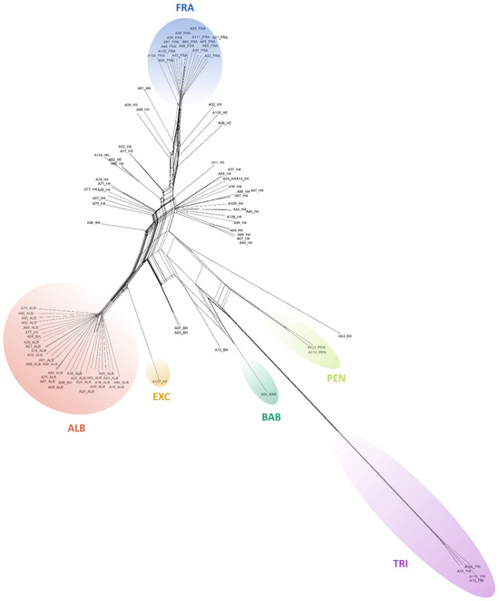 Neighbor-joining unrooted dendrogram for Salix subgen. Salix based on 154,908 binary SNPs generated in SplitsTree (Fit: 99.20). ALB = S. alba; FRA = S. fragilis; TRI = S. triandra; PEN = S. pentandra; BAB = S. babylonica ‘Babylon’, EXC = S. excelsa. All taxa are well separated, most distinctly S. triandra. Hybrid S. alba × S. fragilis forms distinct cluster in the middle part, backcross hybrids with S. fragilis appear half-way between the F1 hybrid and FRA. Other hybrids also have an intermediate position between their parents.