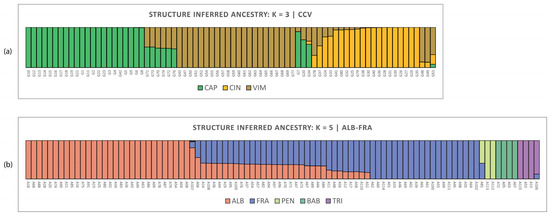 Inferred ancestry by the Structure analysis. Bar plots of individual assignment probabilities for (a) CCV dataset, Salix subgen. Vetrix; K = 3, CAP = S. caprea; CIN = S. cinerea; VIM = S. viminalis; (b) AF dataset, Salix subgen. Salix; K = 5, ALB = S. alba; FRA = S. fragilis; TRI = S. triandra; PEN = S. pentandra; BAB = S. babylonica ‘Babylon’.