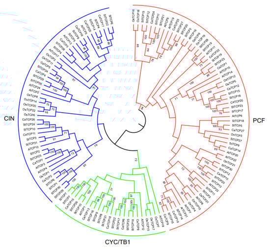 We constructed an unrooted phylogenetic tree (Figure 1) using 134 TCP proteins from Capsicum annuum, Arabidopsis thaliana, Oryza sativa, Solanum tuberosum, and Solanum lycopersicum to explore the evolutionary and phylogenetic relationships among these species. Following the standard classification in Arabidopsis thaliana [28], the 134 TCP members were divided into Class I (PCF) and Class II. Class I (PCF) comprises 62 TCP members (12 CaTCPs, 12 AtTCPs, 10 OsTCPs, 14 StTCPs, and 13 SlTCPs). Class II, which consists of 72 TCPs, was further divided into two subclasses: CYC/TB1 and CIN. Subclass CYC/TB1 includes 25 TCPs (5 CaTCPs, 3 AtTCPs, 4 OsTCPs, 7 StTCPs, and 6 SlTCPs), and CIN includes 47 TCPs (10 CaTCPs, 8 AtTCPs, 8 OsTCPs, 10 StTCPs, and 11 SlTCPs) (Figure 1). The tree revealed that most CaTCPs were phylogenetically closer to StTCPs and SlTCPs than to members from other species. The number of CaTCPs distributed in both subclasses is similar to the scattered distribution pattern of other species (Figure 1; Table S2).