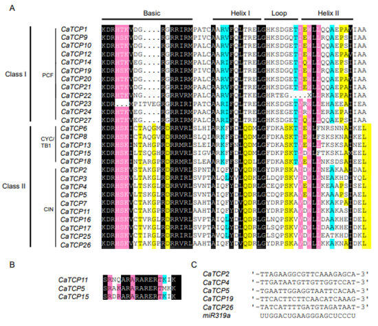 Multiple sequence alignment of two classes of CaTCP proteins. Conserved nucleotides are colored as follows: black, 100%; pink, 90–99%; cyan, 60–89%; and yellow, 50–59%. (A) The putative TCP domain for CaTCP proteins. (B) The putative R-domain for Class II subfamily members of CaTCP proteins. (C) Alignment of predicted target regions for miR319 complementary sequences.