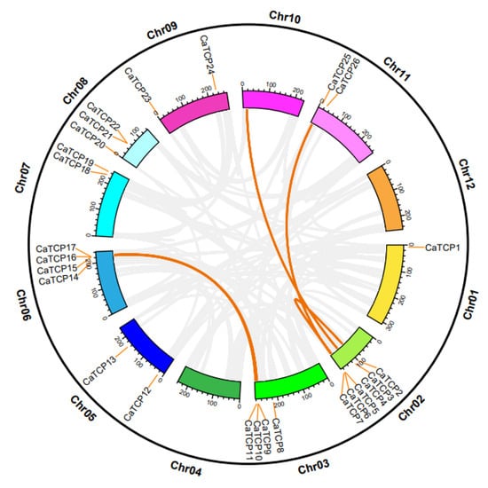 Chromosomal distribution and inter-chromosomal relation of the CaTCPs. Orange lines denote syntenic CaTCP gene pair blocks. All syntenic relationships in the pepper genome are indicated in gray.