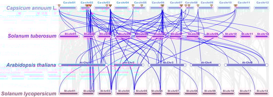 Synteny analysis of TCP genes between pepper, Arabidopsis thaliana, Oryza sativa, Solanum tuberosum, and Solanum lycopersicum. Grey lines present gene blocks that are orthologous to the other genomes. Blue lines indicate the syntenic TCP gene pairs. Red triangles indicate CaTCPs.