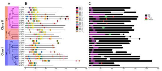 The motifs of CaTCPs were analyzed by identifying conserved regions within their protein sequences, providing a deeper understanding of the evolutionary relationship among CaTCPs (Figure 5B). In total, we predicted 20 motifs (Table S4). The number of conserved motifs among the CaTCPs ranged from 5 to 13 (Table S5). As expected, all 27 CaTCPs exhibited a highly conserved TCP domain. Motifs 1, 2, and 3 were present and conserved in all CaTCPs. Motifs 17 and 19 were only present in Class I. In short, motif structures and the distribution of CaTCP proteins were consistent with the classification of the class, suggesting that TCPs within the same subclass may share similar biological functions.