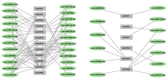 Network diagram of the regulatory linkages among the anticipated miRNAs and putative CaTCPs. Green octagon colors correspond to miRNAs, and gray rectangles represent CaTCPs.