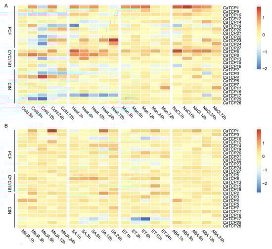 The expression profiling of CaTCPs under abiotic (cold, heat, drought, and salt), and phytohormone [methyl jasmonate (MeJA), salicylic acid (SA), ethylene (ET), and abscisic acid (ABA)] treatments at different time points was conducted using public transcriptome data (Figure 8). In abiotic stress conditions, a few TCP genes had comparatively high expression levels compared to the control group. For example, CaTCP8 was significantly upregulated under heat and cold stress. Notably, CaTCP4, which contains a low-temperature responsive element, exhibited significantly higher expression levels at 12 h under cold treatment (Figure 8A; Table S9). Under drought stress, CaTCP11 and CaTCP26 showed significant upregulation (Figure 8A). Interestingly, under salt stress, three CaTCPs, CaTCP1, CaTCP11, and CaTCP16, had significantly higher expression levels at 6 h, 72 h, and 6 h, respectively. It is noteworthy that all these genes contain a drought-responsive element (Figure 8A; Table S9).