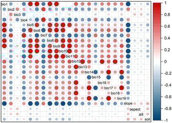 To address potential multicollinearity issues and prevent overfitting of the model predictions, a Pearson correlation analysis was conducted on the environmental variables obtained from WorldClim [39]. The correlation analysis aimed to identify variables that were strongly correlated with each other. Based on the results of the Pearson correlation analysis, the findings were visualized using a correlation heatmap. In the heatmap, darker colors indicate a stronger correlation strength (Figure 2). Then, all the environmental variables were imported into the MaxEnt. Variables with low contribution, as measured by the jackknife in the model, were removed. If two variables had a correlation coefficient (|R|) ≥ 0.8, only the variable with the highest contribution was retained. Ultimately, six variables were selected as the evaluation variables for the model: annual precipitation (Bio12), mean temperature of the coldest quarter (Bio11), minimum temperature of the coldest month (Bio6), temperature seasonality (Bio4), aspect (Asp), and precipitation of the coldest quarter (Bio19) (Table 1). These variables were deemed to have the most significant contribution to the model’s predictions.