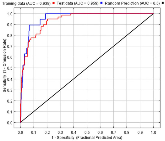 The ROC curves generated from the MaxEnt indicated a high performance in both the training set and the test set. The area under the curve (AUC) value for the training set was 0.939, while the AUC value for the test set was 0.959. These high AUC values, close to 1, suggested that the MaxEnt performed well in the current scenario. The model was able to accurately fit the species distribution data and provide reliable predictions (Figure 3).