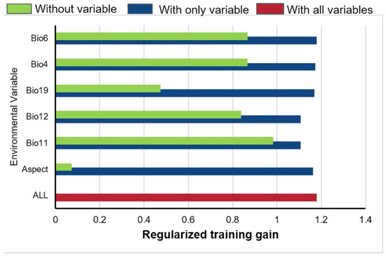 The jackknife test results indicated that the training gain remained stable when each environmental variable was used in isolation, suggesting that these variables individually influenced the predictive ability of the MaxEnt for G. orchidis. The variables that affected the suitable area of G. orchidis were Bio6, Bio4, Bio19 (precipitation of coldest quarter), Bio12, Bio11, and Aspect. Additionally, the training gain decreased when Bio19 and Aspect were not included, indicating that the predictive power of the model would be reduced if these variables were excluded. This suggested that Bio19 (precipitation of coldest quarter) and Aspect had a profound impact on the suitability of G. orchidis. The inclusion of these variables in the model improves its ability to accurately predict the suitable habitat for G. orchidis (Figure 4).