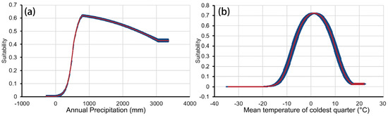 Response curves of G. orchidis. (a) Annual precipitation and (b) mean temperature of coldest quarter.