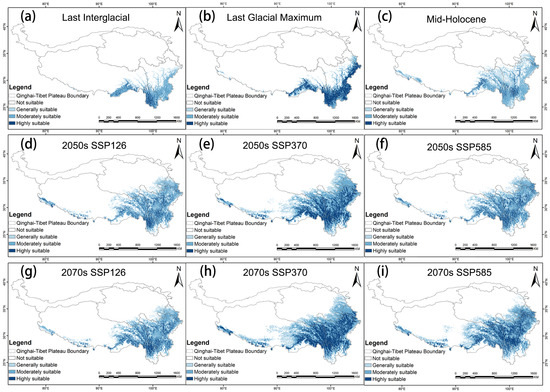 Distribution of potential suitable areas of the QTP region of G. orchidis under different climate change scenarios in the future. (a) The potential geographical distribution of G. orchidis under the last interglacial. (b) The potential geographical distribution of G. orchidis under the Last Glacial Maximum. (c) The potential geographical distribution of G. orchidis under the Mid-Holocene. (d) The potential geographical distribution of G. orchidis under the SSP126 in the 2050s. (e) The potential geographical distribution of G. orchidis under the SSP370 in the 2050s. (f) The potential geographical distribution of G. orchidis under the SSP585 in the 2050s. (g) The potential geographical distribution of G. orchidis under the SSP126 in the 2070s. (h) The potential geographical distribution of G. orchidis under the SSP370 in the 2070s. (i) The potential geographical distribution of G. orchidis under the SSP370 in the 2070s.