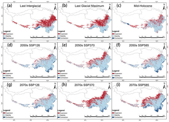 Spatial variation in potential habitat of G. orchidis under different climate scenarios compared with modern climate scenarios. (a) Area changed under the last interglacial, (b) area changed under the Last Glacial Maximum, (c) area changed under the Mid-Holocene, (d) area changed under the SSP126 in the 2050s, (e) area changed under the SSP370 in the 2050s, (f) area changed under the SSP585 in the 2050s, (g) area changed under the SSP126 in the 2070s, (h) area changed under the SSP370 in the 2070s, (i) area changed under the SSP585 in the 2070s.