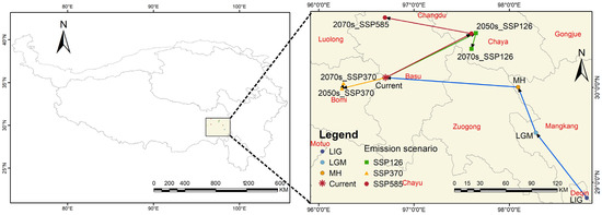 The geographic coordinate point of the centroid of the suitable region for G. orchidis was located in the western part of Basu County (96°42′01″ E, 30°06′13″ N). In the past, the centroid of G. orchidis exhibited a remarkable tendency to transfer in a northwest direction, with a migration distance of 244.5/km. Specifically, during the glacial periods, the centroid showed an overall northward migration. However, during the Mid-Holocene (MH), the centroid shifted westward to coordinates 98°05′34″ E, 30°00′14″ N. Under the future climate scenarios, the migration direction of the centroid showed significant differences. In the SSP126 scenario, the centroid moved towards the northeast, indicating a trend of reverse migration in the medium-term, with the farthest migration distance of 104.96/km compared to other scenarios. In the SSP370 scenario, the centroid shifted westward to Bomi County (96°15′34″ E, 30°02′39″ N), with the least offset distance of 42.92/km. In the SSP585 scenario, the center point initially moved towards the north but eventually shifted northeastward to Chaya County (97°36′09″ E, 30°34′05″ N), which was close to the centroids in the SSP126 scenario. These migration patterns of the centroid point indicate the shifting distribution of the suitable habitat for G. orchidis under different future climate scenarios (Table 6, Figure 10).