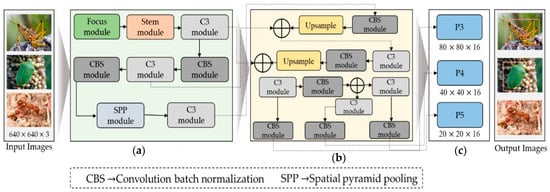 The generic overview of the proposed work for pest detection comprises the following components: (a) the backbone module, (b) the neck module, and (c) the output head module. “Focus module” and “Stem module” presented in green and pink box are our modification blocks in YOLO.