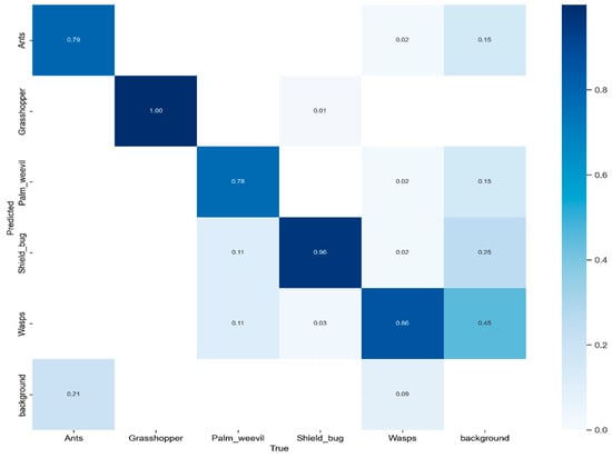 We conducted a performance evaluation of the proposed model using the test set of the dataset, employing a confusion matrix for in-depth analysis, as shown in Figure 7. This confusion matrix encompasses five distinct pest classes and introduces an additional category, “background FN”, to emphasize scenarios where the model failed to identify objects within the image. To present a comprehensive insight into the confusion matrix, we closely analyzed the accuracy in predicting various pest classes, including ants, grasshoppers, palm weevils, shield bugs, and wasps. The accuracy values for these categories were 0.79, 1.00, 0.78, 0.96, and 0.86, respectively.