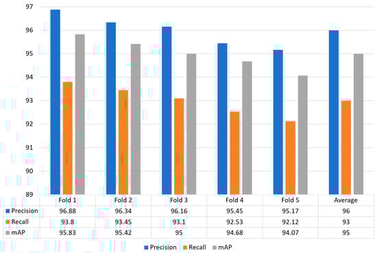 In this strategy, the whole dataset is utilized for training and validation by making five different folds to effectively evaluate the model performance. Figure 8 shows that the proposed model obtained optimal performance for each fold in terms of precision, recall and mAP. The proposed model obtained precision values for each fold: Fold 1: 96.88%, Fold 2: 96.34%, Fold 3: 96.16%, Fold 4: 95.4a 5%, and Fold 5: 95.17%. The recall value of 93.80%, 93.45%, 93.10%, 92.53%, and 92.12% for Fold 1, Fold 2, Fold 3, Fold 4, and Fold 5, respectively. Similarly, the proposed model achieved higher mAP of 95.83%, 95.42%, 95.00%, 94.68%, and 94.07%, respectively. In conclusion, our model obtained an average precision, recall, and mAP of 96.00%, 93.00%, and 95.00%, respectively.