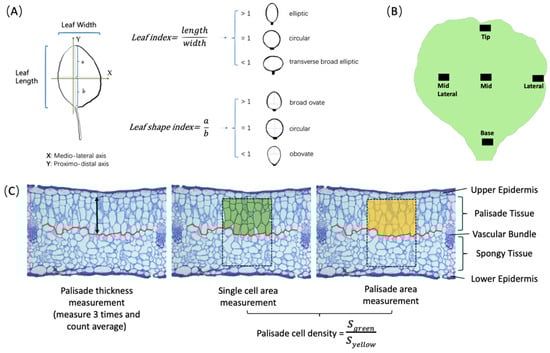 Description of leaf development traits generated in planta and histological traits. (A) The definition of leaf index and leaf shape index jointly define the leaf shape. (B) Illustration of the sampling position for the histological study. (C) Data extraction strategy for tissue thickness and cell density. The red line is drawn manually to separate palisade tissue and sponge tissue according to the shape of the cells. The palisade tissue thickness is the distance from the upper epidermis to the red line. The spongy tissue thickness is the distance from the lower epidermis to the red line. The rectangular dashed frame is the area of 125,600 μm2. The formula of cell density for palisade tissue is depicted in the figure and is similar for cell density of spongy tissue.