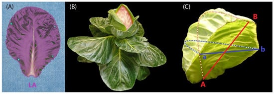Moreover, we analyzed the variations between round and pointed cabbage varieties and found that the shape of the rosette leaves was indicative of the head shape; circular rosette leaves (leaf length/leaf width ≈ 1) correlated with round heads, while elliptical rosette leaves (leaf length/leaf width > 1) were associated with pointed heads. Complementary to our findings, Mao et al. [] found in Chinese cabbage that the curvature and shape of the rosette leaves were indicative of the final head shape: flat rosette leaves corresponded with round heads, inward-curving leaves with cone-like heads, and wavy leaves with cylindrical heads. Moreover, Alemán-Báez et al. [], across 308 cabbage accessions, and Sun et al. [], in 152 Chinese cabbage accessions, identified significant correlations between rosette leaf and head traits. Both studies also discovered QTLs associated with both traits.
