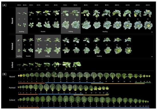 At weekly intervals from 30 to 126 days after sowing (DAS), plants from the three B. oleracea cultivars (round cabbage, pointed cabbage, and collard green) were photographed from both top and side views. In addition, leaves were removed and photographed (see Section 2.2 and Section 2.3). This provided information about whole plant growth, including the leaf number (Table S1), as well as the leaf shape and size (Table S2). Based on both the whole plant phenotype (Figure 3A) and their detached leaves (Figure 3B), we determined four vegetative stages for both round and pointed cabbages: seedling, rosette, folding, and heading.