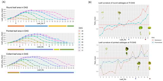 Description of leaf area and leaf curvature. (A) Leaf area from round cabbage, pointed cabbage, and collard green plants at different DAS. The stars indicate the number of the sampled leaves for leaf shape analysis. The bars under each figure represent developmental stages: orange (seedling stage), blue (rosette stage), yellow (folding stage), and green (heading stage). (B) Assessment of the curvature of leaves from round and pointed cabbage plants at 70 DAS. The red dashed line represents the ratio mean equal to 1.0, which means the leaf is flat. The stars indicate the number of sampled leaves for the histological study.