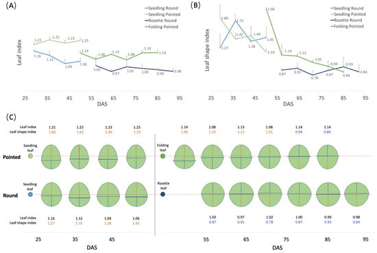Description of leaf shape of round and pointed cabbages. (A) Changes in leaf index of the seedling, rosette, and folding leaves over time. (B) Changes in leaf shape index of the seedling, rosette, and folding leaves over time. (C) Leaf shape simulation diagram based on the values from (A,B). The red lines indicate the position of the medio-lateral axis at the middle of the proximo-distal axis (leaf shape index = 1.0). The orange number means the leaf shape index is larger than 1.0, while the blue number means it is smaller than 1.0.