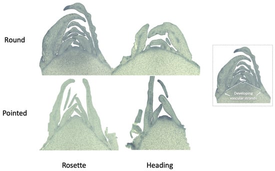 As the leaves developed from the shoot apical meristem (SAM), we assessed the SAM morphology. The SAM differed between the rosette and heading stages of the round cabbage, but also between the round and pointed cabbages. In round cabbages, the SAM exhibits a dome-shaped morphology, transitioning to be more flattened in the heading stage. Conversely, in pointed cabbages, the SAM is a triangular shape at the rosette stage and becomes slightly rounded in the heading stage. A notable distinction between the SAM structures of round and pointed cabbage plants is the smaller angle of the developing vascular strands observed in the pointed cabbage (Figure 8).