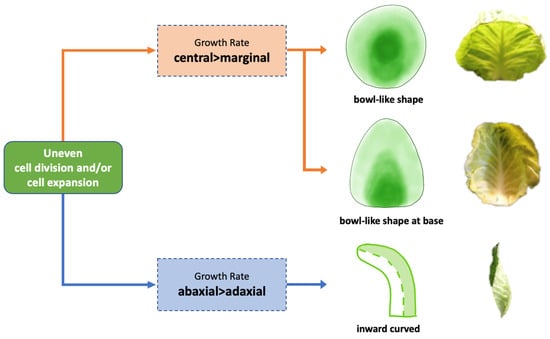 In conclusion, our findings indicate that two synergistic cellular pathways regulate the formation of inward-curving leaves during cabbage leafy head formation (Figure 9). We clearly demonstrated that increased growth at the mid or base positions, in contrast to the lateral positions, leads to the formation of a bowl-like shape of heading leaves in round cabbages and in heading leaves bent at the leaf base for pointed cabbages. The second pathway concerns the different rates of parenchyma (palisade/spongy) cell division and expansion, resulting in the increased growth of the leaf’s abaxial side compared to the adaxial, leading to inward curvature.