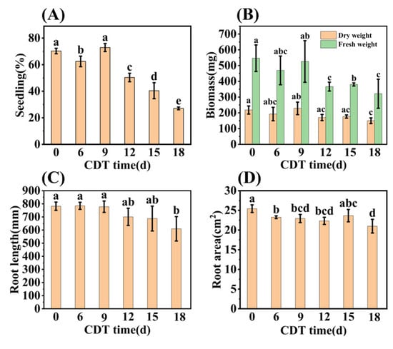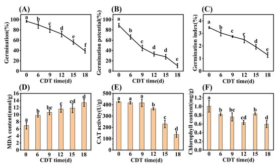 Effect of CDT over 18 days on seed germination level and biochemical properties. (A) Final germination; (B) germination potential; (C) germination index; (D) malondialdehyde (MDA) content; (E) catalase (CAT) activity; and (F) chlorophyll content of the seedling leaf. The seed germination data were obtained seven days after germination. Data are mean ± SE. Different lowercase letters indicate significant differences at p < 0.05, with three biological replicates for all treatments.