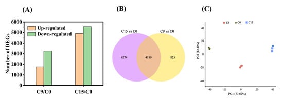 Previous studies have shown that a germination level of 85% is a critical node (CN) for safflower seeds []. In this experiment, we observed that the germination level of C9 seeds was concentrated near the CN, whereas for C15, only approximately half of the seed population survived. Therefore, we selected C9 and C15 seeds for transcriptome sequencing. We classified the DEGs into two groups based on the time intervals of aging: C9/C0 and C15/C0. A total of 15,459 genes (Log2 (Fold change) ≥ 1, p < 0.05) were differentially expressed among the two groups (Figure 3A). In group C9/C0, there were 1758 differentially up-regulated genes and 3247 differentially down-regulated genes (Figure 3A). In group C15/C0, there were 4902 differentially up-regulated genes and 5552 differentially down-regulated genes. Compared with C9/C0, the first phase of viability loss, the expression of a large number of genes was significantly altered under C15/C0, when seed viability had fallen to about 50% (Figure 3A). Meanwhile, in the overlapping region of the two controls, we found 4180 DEGs (Figure 3B). Furthermore, the results of the PCA analysis showed good reproducibility within the groups and clear separation of the three aging comparisons (Figure 3C).