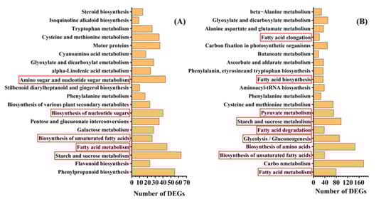 KEGG enrichment analysis of DEGs between (A) C9/C0, (B) C15/C0 seed aging intervals.