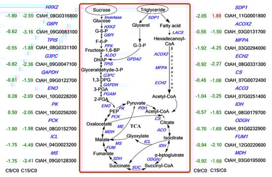 An overview of sugar metabolism, fatty acid degradation, and TCA. The digits in the figure indicate the Log2 (FoldChange) values, the red color indicates up-regulated genes, and the green color indicates down-regulated genes. (Enzyme abbreviations are HXK: hexokinase; G6PI: phosphoglycerate isomerase; PFK: 6-phosphofructokinase; ALDO: fructose-bisphosphate aldolase; TPIS: triosephosphate isomerase; GAPDH: glyceraldehyde 3-phosphate dehydrogenase; PGAM: phosphoglycerate mutase; ENO: enolase; PK: pyruvate kinase; PDH: pyruvate dehydrogenase; CS: citrate synthase; ACO: aconitase; IDH: isocitrate dehydrogenase; OGDH: 2-oxoglutarate dehydrogenase; SUC: succinyl-CoA synthase; SDH: succinate dehydrogenase; FUM: fumarase; MDH: malate dehydrogenase. PCK: phosphoenolpyruvate carboxykinase; MS: malate Synthase; ICL: isocitrate lyase; ME: malic enzyme).