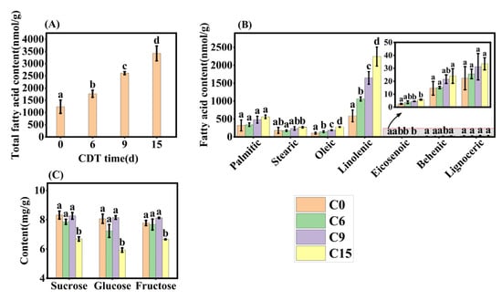 Changes in fatty acid and soluble sugar content under CDT for 6 (C6), 9 (C9), and 15 days (C15). (A) Total fatty acid content; (B) changes in the content of seven fatty acids; and (C) contents of sucrose, glucose, and fructose. Data are mean ± SE. Different lowercase letters indicate significant differences among treatments (p < 0.05).