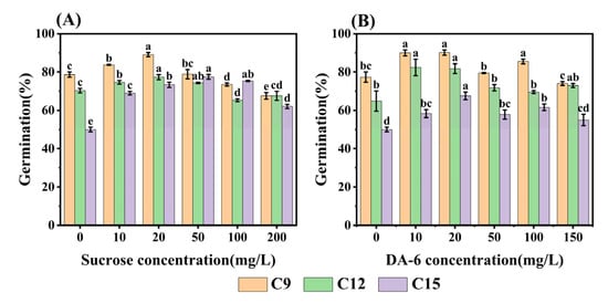 Effects of sucrose and DA-6 on increased safflower seed germination after different degrees of aging up to 15 days (C15). (A) Sucrose; and (B) DA-6. Data are for seeds seven days after germination. Data are mean ± SE. Different lowercase letters indicate significant differences among treatments (p < 0.05).