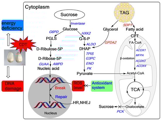 In summary, we propose a model for CDT-mediated seed aging in safflower (Figure 9). Our study found that CDT decreased the antioxidant capacity of safflower seeds, increased cell membrane permeability, and significantly reduced seed viability and seedling growth. Meanwhile, transcriptomic analysis revealed CDT-induced changes in genes involved in sugar metabolism, fatty acid metabolism, and DNA repair. Specifically, fatty acids generated from TAG catabolism by seeds during aging are not efficiently converted to sucrose, which in turn leads to energy deficits. At the same time, the reduced capacity for nucleotide synthesis and the deterioration of the DNA repair ability exacerbate DNA damage, leading to the loss of safflower seed vigor. These findings provide essential information on the molecular mechanisms that influence safflower seed aging. However, elucidating the complex regulatory network among these identified DEGs and their functions in aging is challenging, especially the relationship between cell metabolism and changes in genetic material.