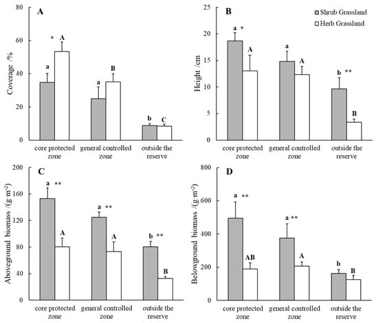 The plant community coverage (A), average height (B), aboveground biomass (C) and belowground biomass (D) inside and outside nature reserve. Note: Different lowercase letters indicate significant differences between locations of shrub grassland (p < 0.05); different uppercase letters indicate significant differences between locations of herb grassland (p < 0.05). “*” indicates that the differences between different plant communities at the same location are significant at the p < 0.05 level, and “**” indicates the p < 0.01 level of significance.