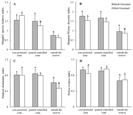 Plant community Margalef species richness index (A), Shannon–Wiener diversity index (B), Simpson dominance index (C) and Pielou eveness index (D) inside and outside the nature reserve. Note: Different lowercase letters indicate significant differences between locations of shrub grassland (p < 0.05); different uppercase letters indicate significant differences between locations of herb grassland (p < 0.05).
