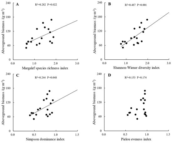 The relationship between plant community aboveground biomass and Margalef species richness index (A), Shannon–Wiener diversity index (B), Simpson dominance index (C) and Pielou eveness index (D).