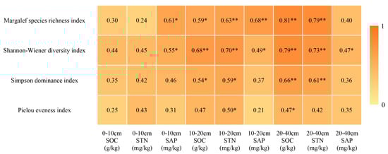 As shown in Figure 4, the Pearson correlation analysis showed that there were positive correlations between the plant community diversity and soil nutrients in all cases. Among them, the Margalef richness index and Shannon–Wiener index had a significant positive correlation with the SAP in the 0–10 cm soil layer; the Margalef richness index, Shannon–Wiener index and Simpson index had a significant positive correlation with the SOC content in the 10–20 cm soil layer; and all four diversity indices had a significant positive correlation with the 10–20 cm STN. The Margalef richness index and Shannon–Wiener index showed a significant positive correlation with the SAP in the 10–20 cm soil layer. All four diversity indices showed a significant positive correlation with the SOC in the 20–40 cm soil layer. The Margalef richness index, Shannon–Wiener index and Simpson index showed a significant positive correlation with the STN content in the 20–40 cm soil layer. The Shannon–Wiener index showed a significant positive correlation with the SAP in the 20–40 cm soil layer. The α-diversity index was more strongly correlated with the SOC and STN content in the 10–20 cm and 20–40 cm soil layers than in the 0–10 cm soil layer.