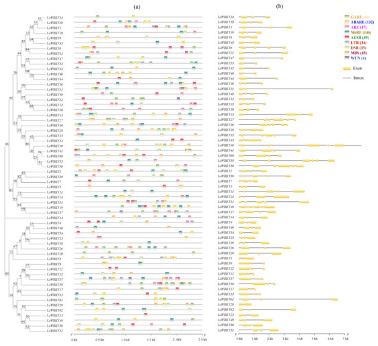 Luffa cylindrica LcWRKY promoter elements and structures according to phylogenetic relationships. The phylogenetic tree was constructed on the basis of the full-length L. cylindrica WRKY protein sequences using MEGA (version 7.0). The proportional lengths of the WRKY genes are presented. The groups are differentiated by color. (a) The promoter elements were analyzed using the TBtools software (version 1.6). (b) The LcWRKY gene structures were examined using the Gene Structure Display Server 2.0 software.