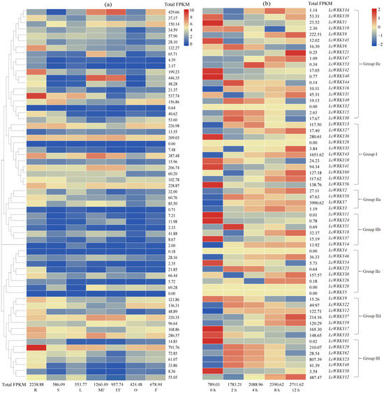 Tissue-specific and low-temperature-stress-induced LcWRKY expression profiles. Transcriptome data were used to determine the LcWRKY expression profiles. The color scale represents the FPKM normalized log10-transformed counts, with blue and red indicating low and high expression levels, respectively. (a) Tissue-specific LcWRKY expression profiles. (b) LcWRKY expression levels in the leaves at five time-points during a low-temperature treatment.