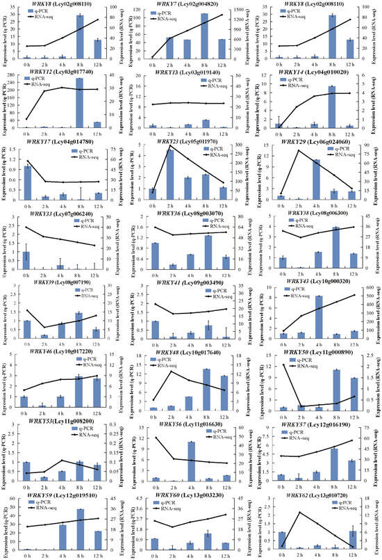 To verify the RNA-seq data, 24 LcWRKY genes related to abiotic stress tolerance (6 from group I, 12 from group II, and 6 from group III) were selected for a quantitative real-time polymerase chain reaction (qRT-PCR) analysis (Figure 5). There were significant differences in the expression levels of these 24 LcWRKY genes, many of which were highly expressed during the low-temperature treatment. Specifically, the LcWRKY2, LcWRKY7, LcWRKY8, LcWRKY12, LcWRKY14, LcWRKY36, LcWRKY38, LcWRKY46, LcWRKY48, LcWRKY50, LcWRKY57, and LcWRKY59 expression levels peaked at 8 h, whereas LcWRKY29, LcWRKY43, and LcWRKY56 were most highly expressed at 4 h. Notably, LcWRKY23 was highly expressed only at 2 h, while LcWRKY13, LcWRKY33, LcWRKY39, LcWRKY41, LcWRKY53, LcWRKY60, and LcWRKY62 expression levels were almost undetectable throughout the low-temperature treatment period. There was a strong positive correlation (R2 = 0.8097; p ≤ 0.01) between the qRT-PCR and RNA-seq data, even for the LcWRKY genes that were generally expressed at low levels (Figure 6).