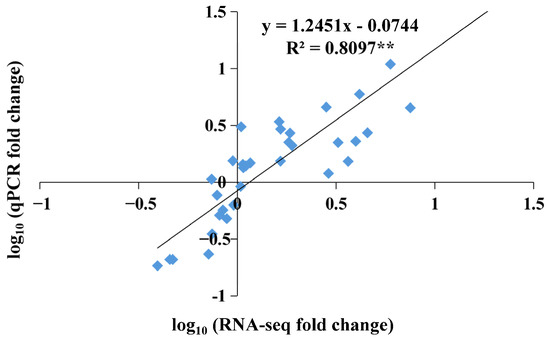 Regression analysis of the fold-change values determined on the basis of transcriptome sequencing (RNA-seq) and qRT-PCR data. For the RNA-seq analysis, the FPKM values at 2, 4, 8, and 12 h were compared with the FPKM value at 0 h to calculate the fold-change. For the qRT-PCR analysis, the expression levels at 2, 4, 8, and 12 h were normalized against the expression level at 0 h to calculate the fold-change. **, significant correlation (p < 0.01).