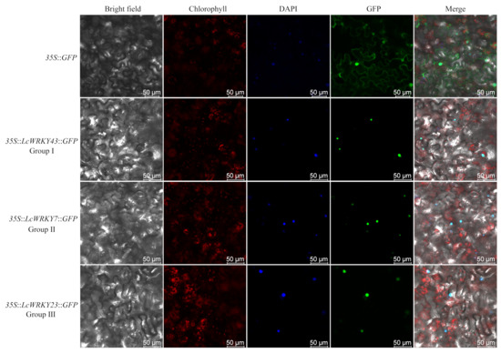 To examine the subcellular localization of the LcWRKY proteins, constructs were generated for the expression of LcWRKY43 (group I), LcWRKY7 (group II), and LcWRKY23 (group III) fused to the green fluorescent protein (GFP). The constructs were inserted into Nicotiana benthamiana via an Agrobacterium-tumefaciens-mediated transformation for the subsequent transient expression and subcellular localization analysis. In the control cells containing the empty vector (35S::GFP), green fluorescence was distributed in the cell membrane, cytoplasm, and nucleus, whereas in the cells containing a 35S::LcWRKY::GFP construct, green fluorescence was detected exclusively in the nucleus. Accordingly, LcWRKY7, LcWRKY23, and LcWRKY43 were localized to the nucleus, which was consistent with the predicted subcellular localization (Supplementary File S1 and Figure 7). The nuclear localization of these three LcWRKY proteins is in accordance with their putative roles as TFs.