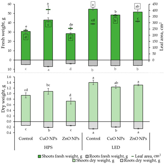 Effects of different lighting (HPS and LED) and nanoparticles (30 ppm CuO and 800 ppm ZnO) on ice plant (n = 10) growth characteristics: leaf fresh and dry weight, root fresh and dry weight, and leaf area. The data were processed using analysis of variance (ANOVA) and the Tukey (HSD) multiple range test at the confidence level p = 0.05. Different letters represent significant differences. The statistical reliabilities presented in squares are assigned to fresh weight. NPs—nanoparticles, control—plants treated with deionized water, HPS—high-pressure sodium lamps, LED—light-emitting diodes.