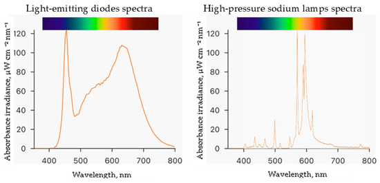 Spectra of different lighting light-emitting diodes and high-pressure sodium lamps.