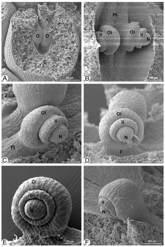 Comparing the well-developed ovules sampled in mid-December to those taken at the beginning of February in the following year, it was found that Magnolia stellata rests during winter. At the beginning of March, the ovule’s inner and outer integuments visibly differentiate (Figure 2B). In the SEM photo of a two-week-old ovule, the inner integument forms a ring around the nucellus, and the outer integument is more or less around the inner integument and nucellus (Figure 2C,D). The nucellus protrudes in the middle. Because of the development of the ring-shaped outer integument, the width of the ovules doubles over a period from four to six weeks (Figure 2E,F).